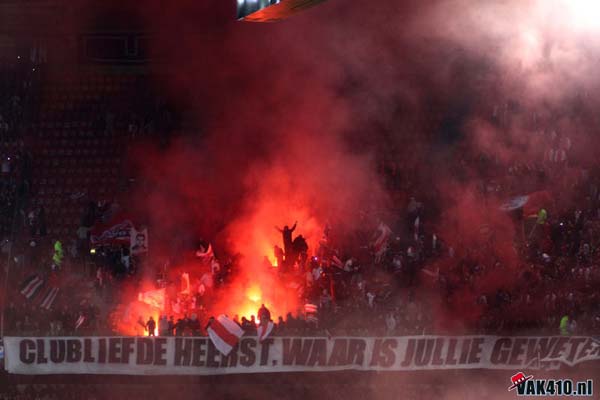 Amsterdam – Indrukwekkend protest tegen het Moderne Voetbal van Vak410 gisterenavond. Ben je tegenwoordig sowieso al een bofkont als je geen stadionverbod hebt… weten “ze” je wel op een andere manier buiten te houden. 153,24 euro voor een passe-partout is een vieze vieze streek. Een gebrek aan realiteitszin. Zag je die beelden met die beteuterde gezichten van die witteboord criminelen op de Ajax-eretribune? Gewetenloos. De bovenste foto is van het uitvak met Milan-supporters. Die zijn voor maar liefst 80 euro (!!!) getild. 80 euro voor een kaartje is een misdaad tegen het voetbal! Against Modern Football! Foto’s via afca.nl en vak410.nl