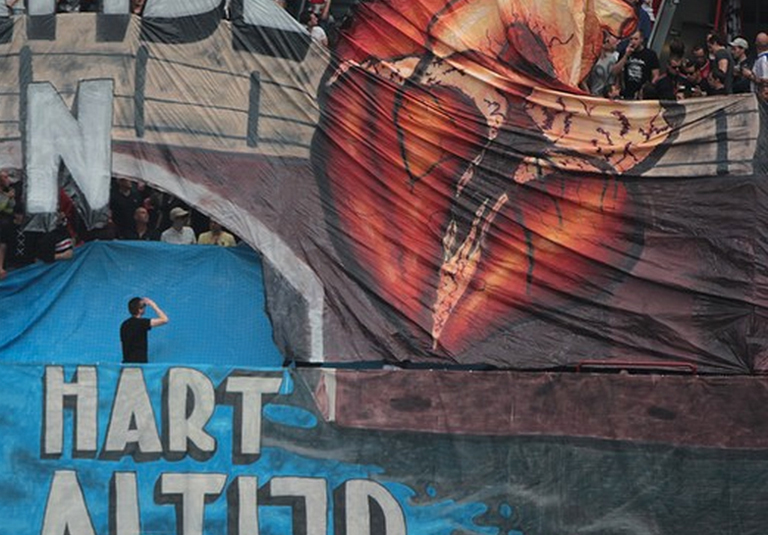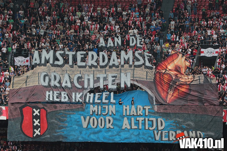 AMSTERDAM – Next level tifo by Vak410, the fanatical supporters of Ajax Amsterdam. The text is from an old Amsterdam classic and says something like “For whole my life I sold all of my heart to the the Amsterdam Canals”. A complete photorepo at Vak410.nl