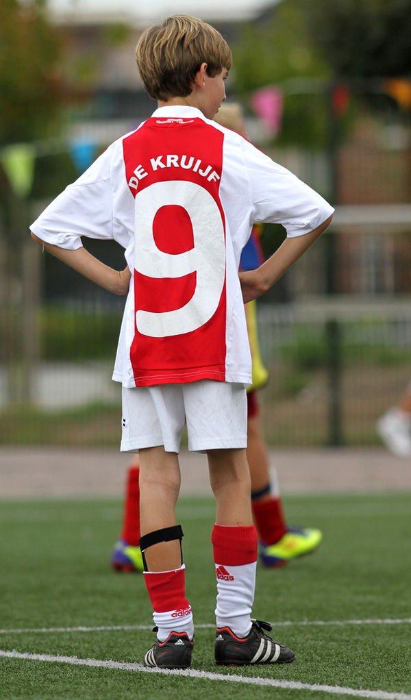 shirt – Si-mon Kist-e-maker! Duidelijk gevalletje van compensatiedrang. Jammer van die kicksen. Die hadden paars moeten zijn. Met gele of roze strepen. Ook jammer van die baan in het midden. Anders had het rugnummer wat groter gekund… (tnx Sjaak)