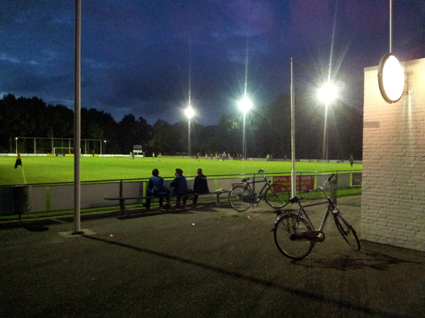 Gelukkig is de TomTom ons goed gezind. Binnen een goed kwartier zijn we op plaats van bestemming. Terwijl rechts van de weg op een openbaar ‘veld’ de trainingen plaatsvinden, vindt het spektakel aan de linkerkant plaats. Even het bruggetje over de sloot over en hop… we staan langs het hoofdveld van v.v. Kerkwijk. In de rust uiteraard even een kijkje nemen in de lokale kantine, alwaar gemoedelijkheid overheerst. Zoals altijd pas weer naar het veld als de tweede helft alweer is begonnen. Maar de plaatselijke hangjongeren (present op de fiets) hebben het bankje achter een van de doelen al ingenomen. Een tribune is er niet, dus dan maar gewoon tussen de dug-outs in staan genieten. OJC D4 verliest met 5-2, maar dat is geflatteerd en interesseert natuurlijk niemand iets. Wij hebben weer een prachtig voetbalavondje en idyllisch sportpark kunnen noteren!Groeten, Mark