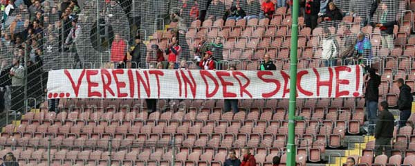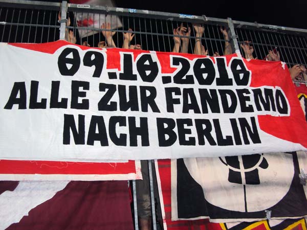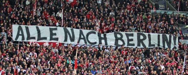 Berlijn – Overmorgen (zaterdag) houden voetbalsupporters een mega-demonstratie in Berlijn tegen het moderne voetbal. Om 13.00 uur allemaal verzamelen op de Alexanderplatz. Al wekenlang wordt er in Duitse stadions middels spandoeken campagne gevoerd voor deze demo. Zo’n 150 supportersgroepen hebben inmiddels aangekondigd mee te zullen lopen. Uiteraard zal ook deze demonstratie, zoals iedere demonstratie, wel uit de hand lopen. Maar dat maakt geen reet uit. Sterker, zonder een oproer geen media-aandacht. Het gemeenschappelijk doel moet verspreid worden: Against Modern Football!!! Voor meer info check je hierzo erhalt-der-fankultur.de/