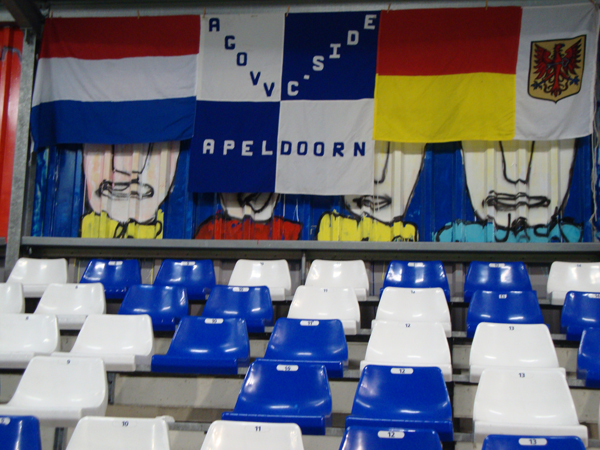 Apeldoorn – Schandalig, maar niemand vans ons was er ooit eerder geweest. Het Fly Brazil-stadion van AGOVV. En het was er geweldig. Ondanks het dramatische voetbal (een 0-6 afstraffing door Sparta). Maar verder niets dan lof voor AGOVV. Vriendelijke mensen, sympathiek stadion en een uitstekende kantine met vriendelijke prijzen. En fokking veel saus bij je bal. Een heeeeele kleine kern, met zeeeeeeer jonge supporters. Maar wanneer die bij een 0-1 achterstand gaan zingen “Wij staan onderaan en vieren feest” dan weet je dat het met de mentaliteit in Apeldoorn wel goed zit. Boys in blue… kop op!!!