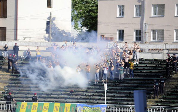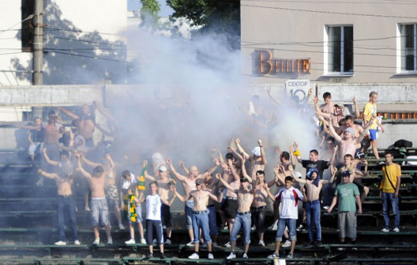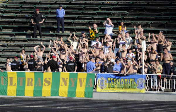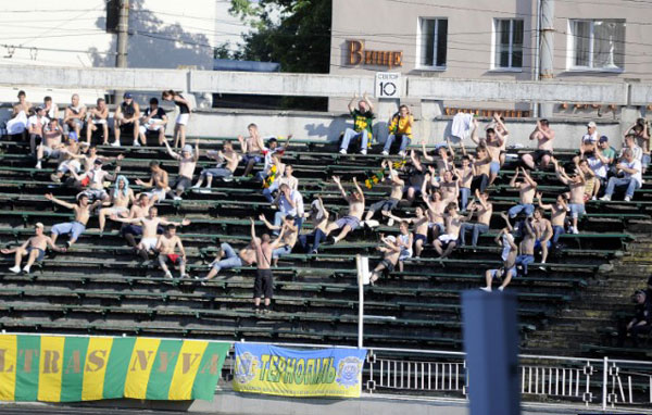 Oekraïne – Die gruwelijke foto van die held van Nyva Ternopil liet ons maar niet los. FootballCulture ging op zoek naar de club Nyva Ternopil. Blijkt dat ze de laatste 13 wedstrijden er 10 verloren en 3 gelijkgespeeld hebben. Simon K! Geen enkele overwinning dus. De fotos komen uit de laatste wedstrijd van afgelopen seizoen. Deze werd in stijl afgesloten, want met 1-2 verloren. Maar uitslagen zijn voor cijferneukers, niet voor supporters. Lang leve de lol en de polonaises! Simon Kist-e-maker voor altijd!!! (ptjr dank)