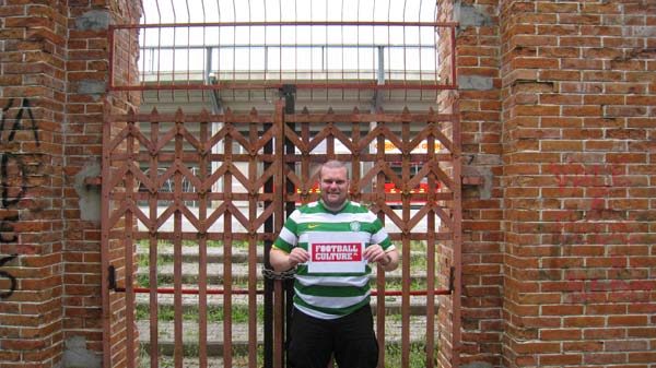 Italië – Onze Bhoy met een megasticker voor het stadion van Castel di Sangro.