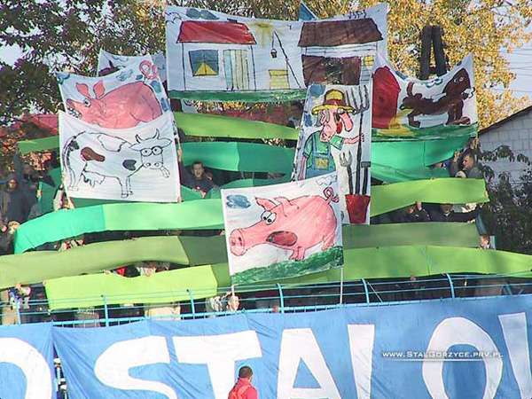 Polen – Misschien is het al een oudje. Maar daarom niet minder origineel. Een superboerentifo uit Polen. Is weer eens wat anders dan al die agressieve skelletten. (jos dank)