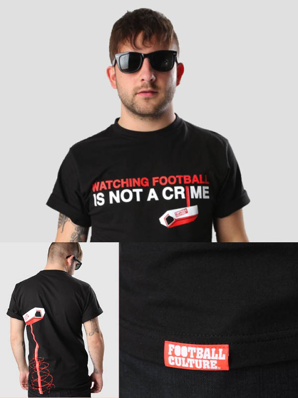 WATCHING FOOTBALL IS NOT A CRIME SHIRT – Voetbalsupporters zijn schuldig. Sowieso. Tot ze het tegendeel bewijzen. En dan nog. “Zo, je hebt er gister weer een lekker zooitje van gemaakt”. Je collega’s hebben tv gekeken. En dan moet jij je weer verontschuldigen. Verdedigen. Uitleggen. Dat je fanatieke supporter bent, maar geen hoolie. FC zegt: Stop de criminalisering van fanatieke voetbalsupporters! We zijn bijna op een punt beland dat je die steen net zo goed wél kan gooien. Voetbalsupporters zijn de nieuwe Marokkanen. Als je op zondagochtend meemag met de verplichte combi. Omdat je braaf je pasfoto met nummer hebt opgestuurd. Als je niet opgepakt bent voor wildplassen en vervolgens de preventieve fouillering en paspoortcontrole voorbij komt. Dan ben je een enorme mazzelpik en neem je voor lief dat je alsnog de hele wedstrijd recht in je porem gefilmd wordt. Stadions zijn plekken geworden waar niets mag. Maar wel alles moet. Fok dat! Watching Football is not a Crime! De zwarte shirts zijn aan beide kanten bedrukt in rood en wit.