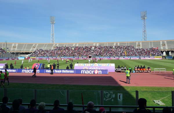 Cagliari – Vorige week werd in Velsen-Zuid de nieuwe staantribune van Telstar geopend. Zie hierzo. De nieuwe tribune was binnen de oude tribune gebouwd. Dat trucje is dus afgekeken van Cagliari, waar al langer 3 nieuwe tribunes binnen het oude stadion zijn neergezet. De nieuwe tribunes staan op de sintelbaan. Mooi oplossing want supporters zitten nu dichter bij het veld. (dank aan Anton)