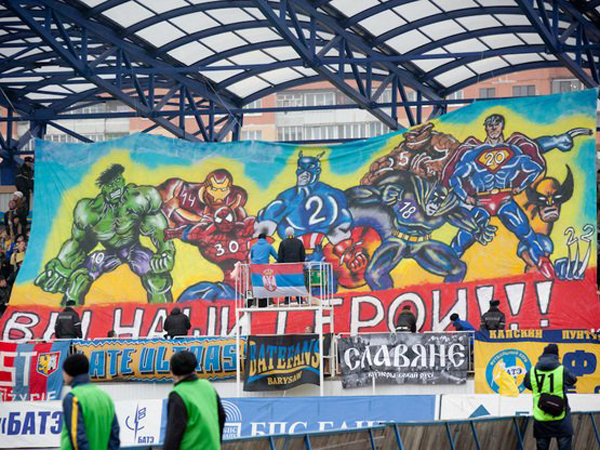 Belarus – Zijn zeker niet gespierd he, onze superhelden??? Neuhhhh!!! Superheldendoek tijdens de wedstrijd BATE Borisov x Dnepr Mogilev. Nog opvallender vinden we eigenlijk die aparte tribune voor de capo…