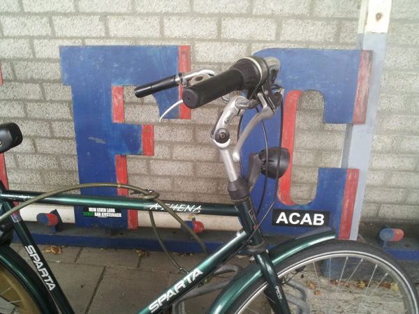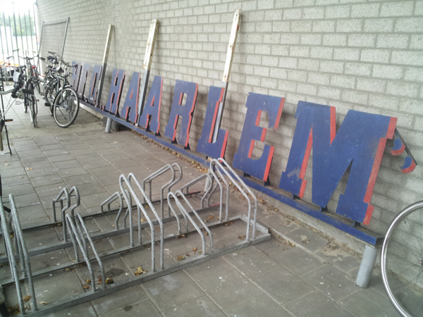 Haarlem – Verdomme wat mooi. Die roemruchte letters van de Jan Gijzenkade. H.F.C. Haarlem. Die rode schaduw. Die puntje tussen H.F.C. Die ontbrekende schaduw bij een deel van de M. Zichtbaar met liefde gemaakt. De club uit 1889. En nu staan die prachtige letters ergens te slijten. Tegen een schoon muurtje dat nog niets heeft meegemaakt in z’n leven. Fietsen achteloos erbij. Best pijnlijk. Het maakt ons een beetje meewoedig. Dank aan Stadion Gebod voor deze mooi foto’s!