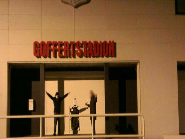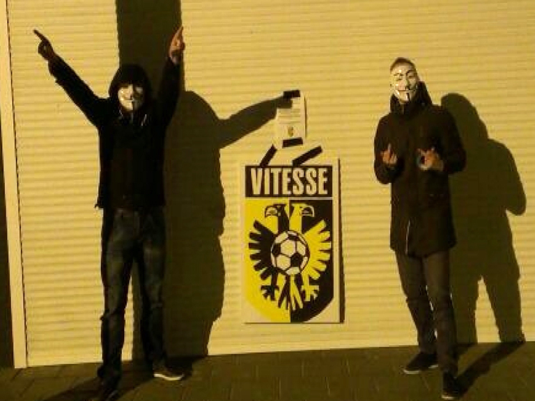 NIJMEGEN – Afgelopen maandag is het logo van NEC van de gevel van het Goffertstadion gewaaid. Onder het motto “Beter een goede buur dan een verre vriend” bezorgden Vitesse-supporters afgelopen nacht een nieuw logo in Nijmegen.