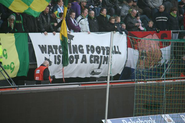 FC Den Haag – Komend weekend zullen in meerdere stadions spandoeken met de tekst “Watching Football is not a crime” te bewonderen zijn. Er is een actie-weekend georganiseerd (voor info: football-is-not-a-crime@hotmail.nl). Maar niet bij FC Den Haag. Want de boys reizen uit protest niet af naar Rotterdam. Ze kregen maar 650 kaarten en dat is schandalig weinig. Zodoende hing het doek al afgelopen weekend in het FC Den Haag-stadion. Maarrehhhh… die inspiratie he? Met die hangende kk-camera in het woord CRIME…. komt-ie vandaan dan joh 🙂