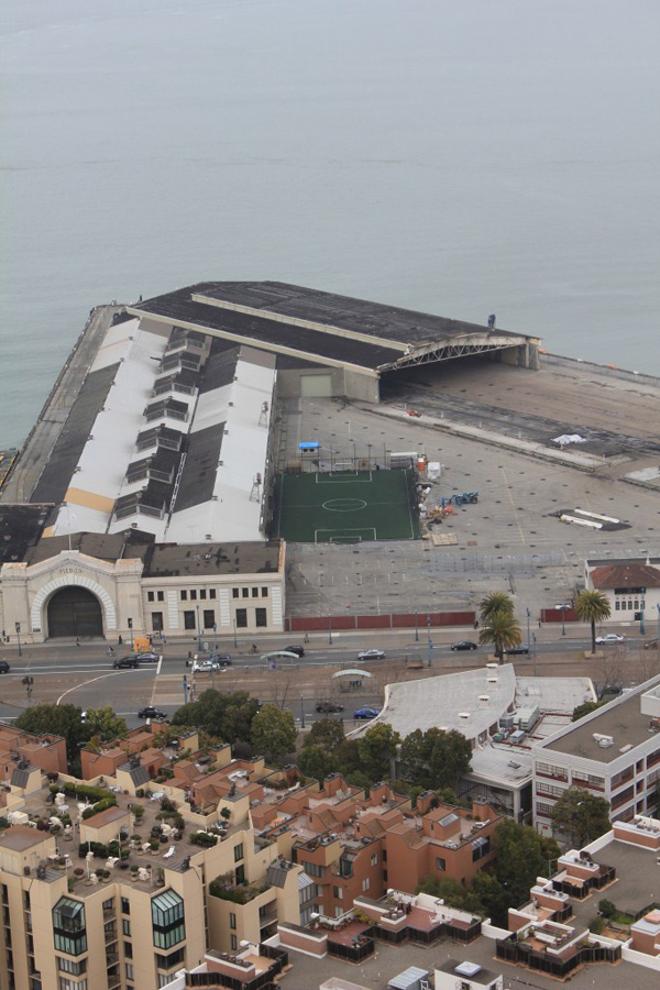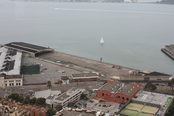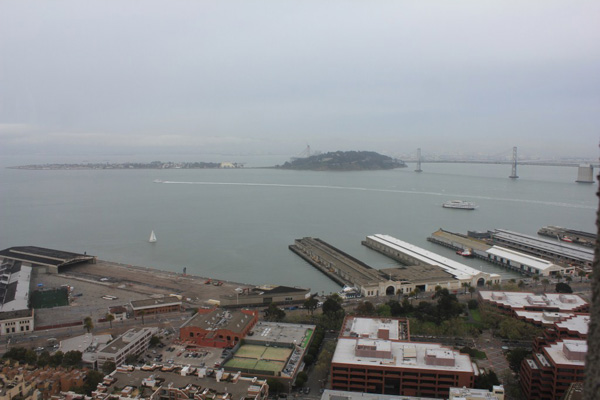 San Francisco – Kunstgrasveld nabij Fishermen’s Wharf met op de achtergrond de brug naar Oakland. (tnx to Jaap)