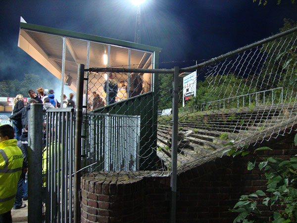 Classic! De nieuwe staantribune is op de oude staantribune geplaatst. Het oude scorebord staat er nog en werkt nog prima.