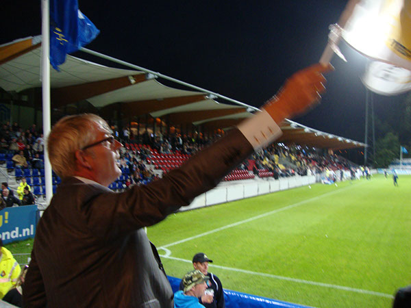 Alle bestuur tegen de muur. Van heel Nederland. Behalve Pieter. De beste voorzitter ter wereld. De hele wedstrijd staan en af en toe vlaggen.