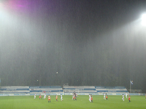 IJmuiden – Omdat we een beetje chagrijnig werden van die zurige Hard Gras (Hollandse School) besloten we onszelf wat op te vrolijken. Laat in Velsen-Zuid nou net een nieuwe tribune geopend worden. Een staantribune!!! Maandagavond, 2045 uur, stromende regen. Telstar 1963 X FC Dordrecht. Precies wat we nodig hadden.